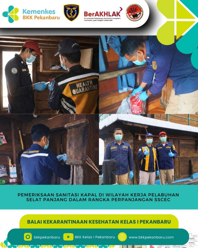 Dalam rangka perpanjangan Ship Sanitation Control Exemption Certificate (SSCEC) Kapal KM. Merpati Jaya, petugas BKK Pekanbaru melakukan pemeriksaan menyeluruh yang meliputi: