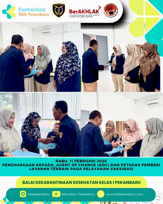 Hari ini, BKK Kelas I Pekanbaru menyerahkan Sertifikat Penghargaan kepada Agent Of Change (AOC) dan petugas pemberi layanan terbaik pada pelayanan vaksinasi sebagai wujud terima kasih atas kontribusi dan kerja keras yang telah diberikan.