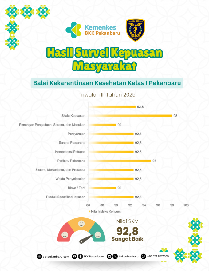 Dalam rangka meningkatkan kualitas pelayanan publik sesuai Permenpan RI Nomor 14 tahun 2017 tentang pedoman penyusunan survey kepuasan masyarakat, Balai Kekarantinaan Kesehatan Kelas I Pekanbaru mengharapkan pengguna untuk dapat mengisi form survey kepuasan pelanggan agar kami dapat mengevalusi kinerja pelayanan yang diberikan kepada masyarakat.